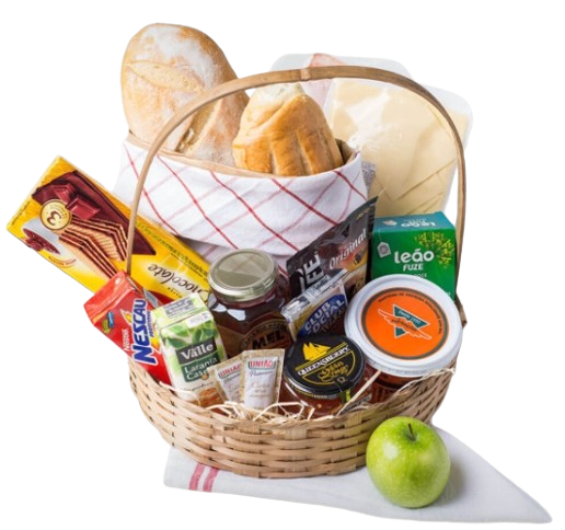 Cesta de café da manhã. Completa, ela traz biscoitos, frutas, bebidas, frios, pães e manteiga