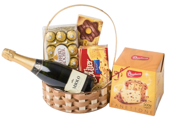 Essa cesta é composta por uma garrafa de espumante de 750ml, pão de mel, bolacha, um delicioso Panettone e chocolate.