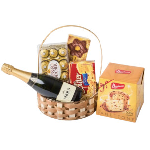 Essa cesta vem com quatro variedades de chocolate, um urso de pelúcia e chocolates.